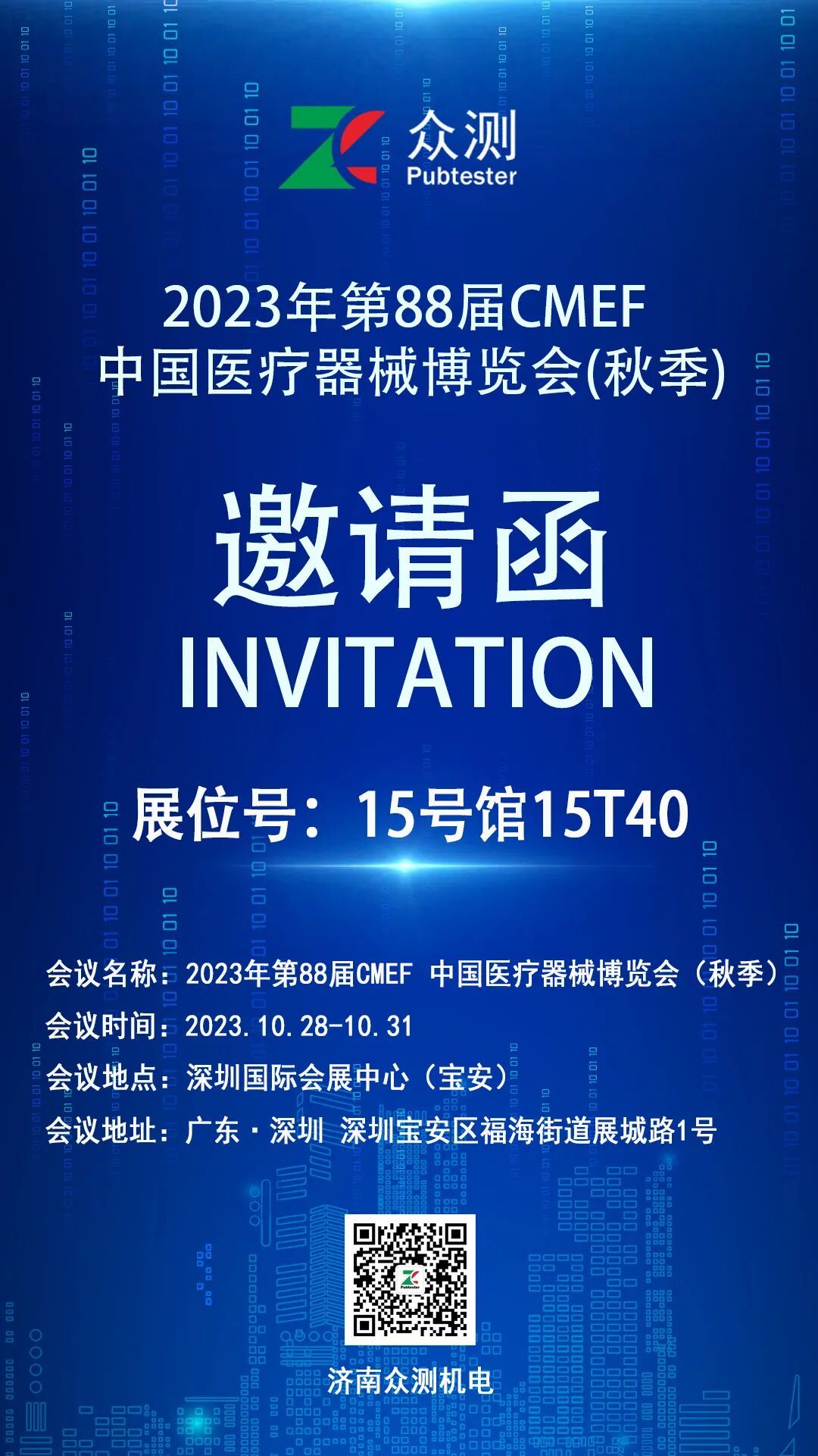 中国国际医疗器械博览会始创于1979年,是世界三大医疗展之一。展会覆盖了医疗器械全产业链,是亚太地区集产品技术、新品发布、采购贸易、品牌传播、科研合作、学术论坛、教育培训为一体的医疗器械博览会。 “第88届中国国际医疗器械博览会”将于2023年10月28日至31日在深圳国际会展中心(宝安区)拉开帷幕。济南众测机电设备有限公司诚邀您共赴CMEF。届时,众测机电将携带多款无菌医疗器械检测仪器亮相现场,诚邀您莅临参观指导,共襄盛举! 【时间】2023.10.28~2023.10.31 【地点】深圳国际会展中心(宝安) 【展位号】15号馆15T40(济南众测) 15号馆15T40 济南众测机电展示产品 ▼ 关于众测 济南众测机电设备有限公司 (品牌Pubtester)成立于泉城济南,是一家专注于实验室分析检测仪器研发的高新技术企业,公司专注于为食品、药品、医疗器械、包装材料、新材料、新能源、日用化妆品等提供专业科学试验仪器和全面质量控制解决方案。经过多年的发展,众测多项新技术、新产品获得证书,并拥有自主知识产权。 公司重点发展个性化定制服务,针对客户提出的差异化需求,能够提供优质解决方案和技术支持,力争为客户提供高品质产品和高质量服务。公司拥有完善的售后服务体系,能够为您提供现场、电话沟通、远程视频、常见问题视频库等立体服务,我们的服务:二十四小时三百六十度。 众测机电一直以专业的技术和优质的售后服务为中国的食品药品质量安全一路保驾护航,全力打造国内外包装检测仪器值得信赖的品牌。
